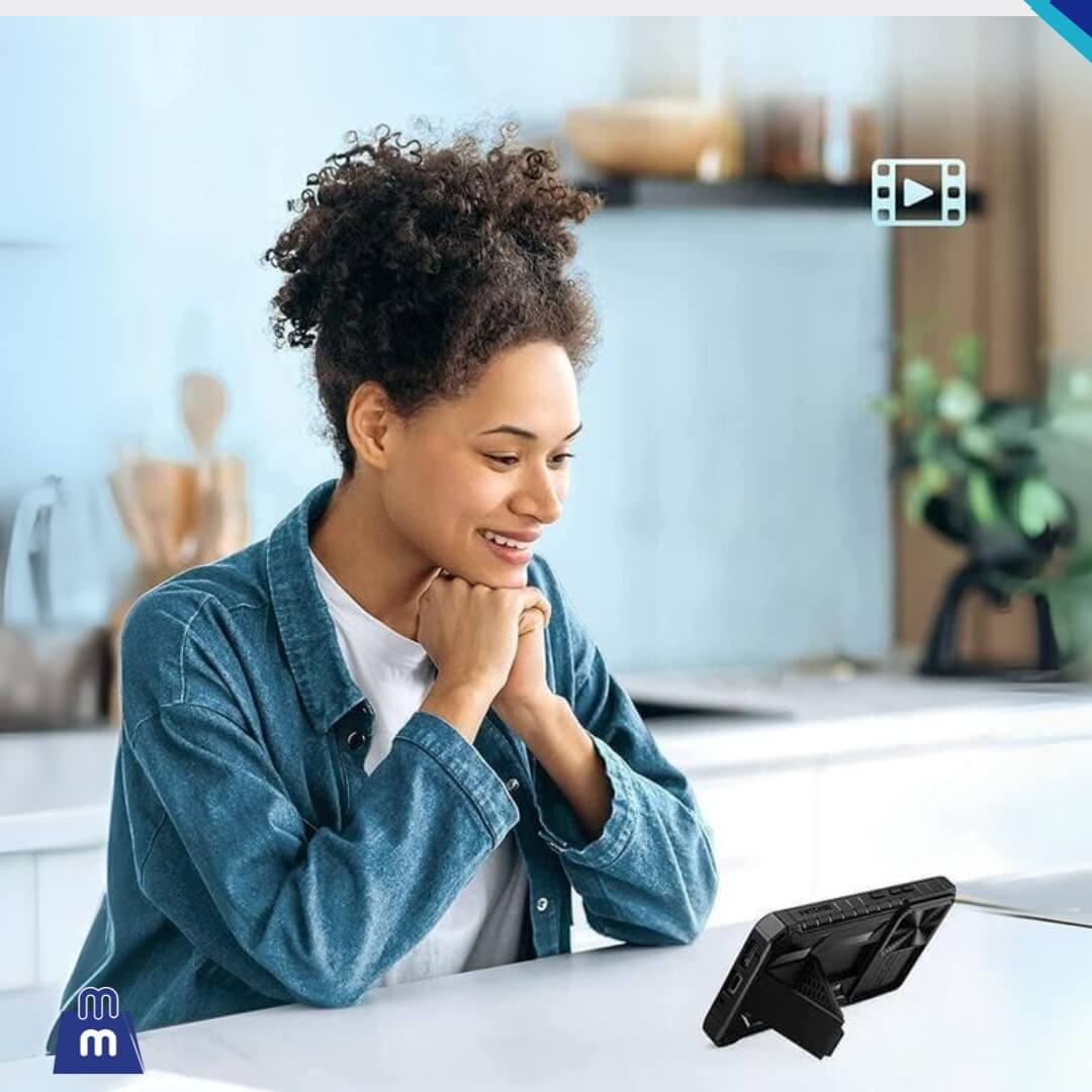 La funda cuenta con un soporte plegable incorporado que permite visualizar tu teléfono tanto en modo vertical como horizontal. Ideal para ver películas, jugar, leer o realizar videollamadas, este kickstand liberará tus manos, permitiéndote disfrutar de una experiencia manos libres en todo momento. Su diseño ergonómico asegura un ángulo de visión cómodo y estable.
